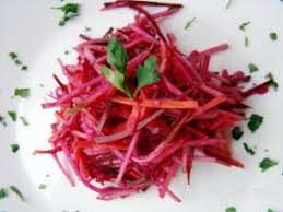 treba krupno narendati cveklu i upola manji koren od celera, začiniti sa malo